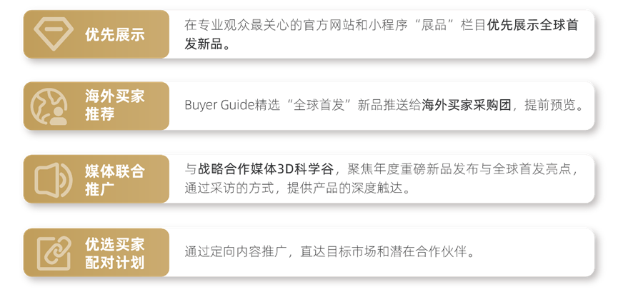 01而这些关键环节,TCT亚洲展已为你搭建完成。——2026年TCT亚洲展全新推出的“World Premier Selection全球首发赋能计划”,为行业企业提供专属展示、全平台预热、精准买家推送及媒体深度曝光。在TCT亚洲展首发,就意味着定义行业年度趋势,抢占用户心智与采购制高点。