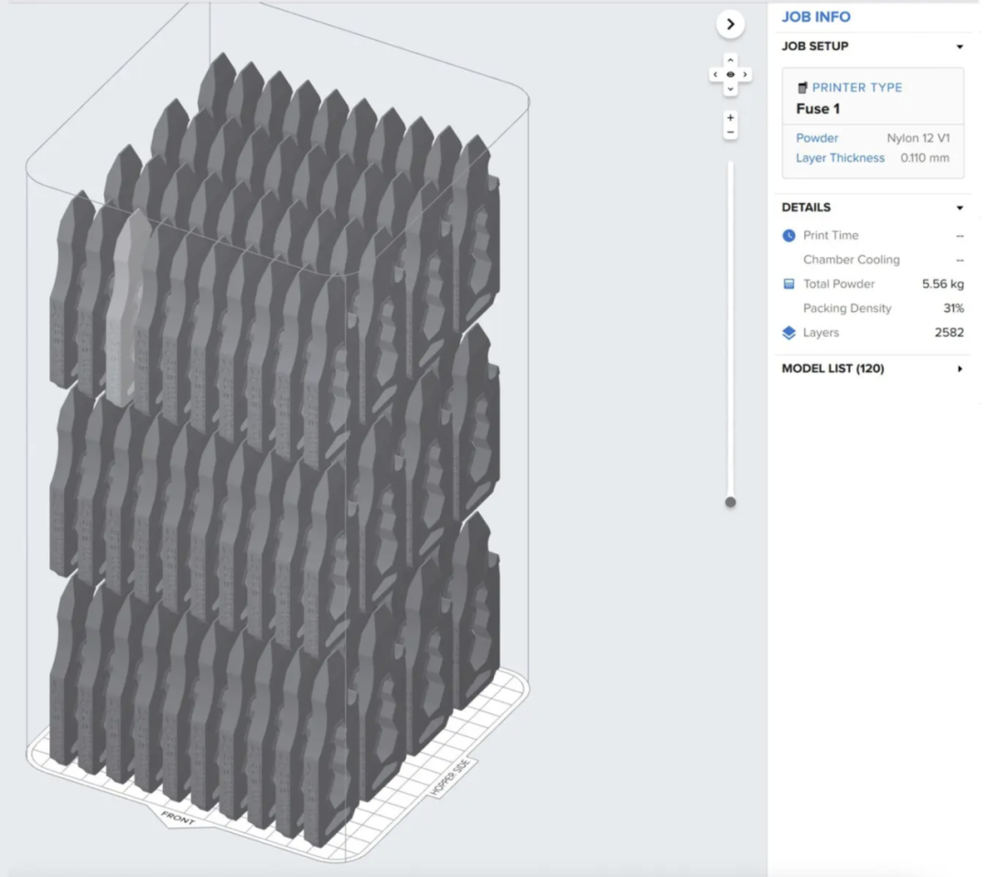 为了确保尽可能少的浪费,装填密度和刷新率应尽可能接近。例如,如果PreForm中报告的打印装填密度为30%,那么30%的刷新率将不会产生多余的使用材料。在这种情况下,烧结成零件的粉末将被新粉末替换,用于下一次打印。关注粉末刷新率和打印装填密度将帮助您最大限度地利用粉末,并降低每个零件的成本。