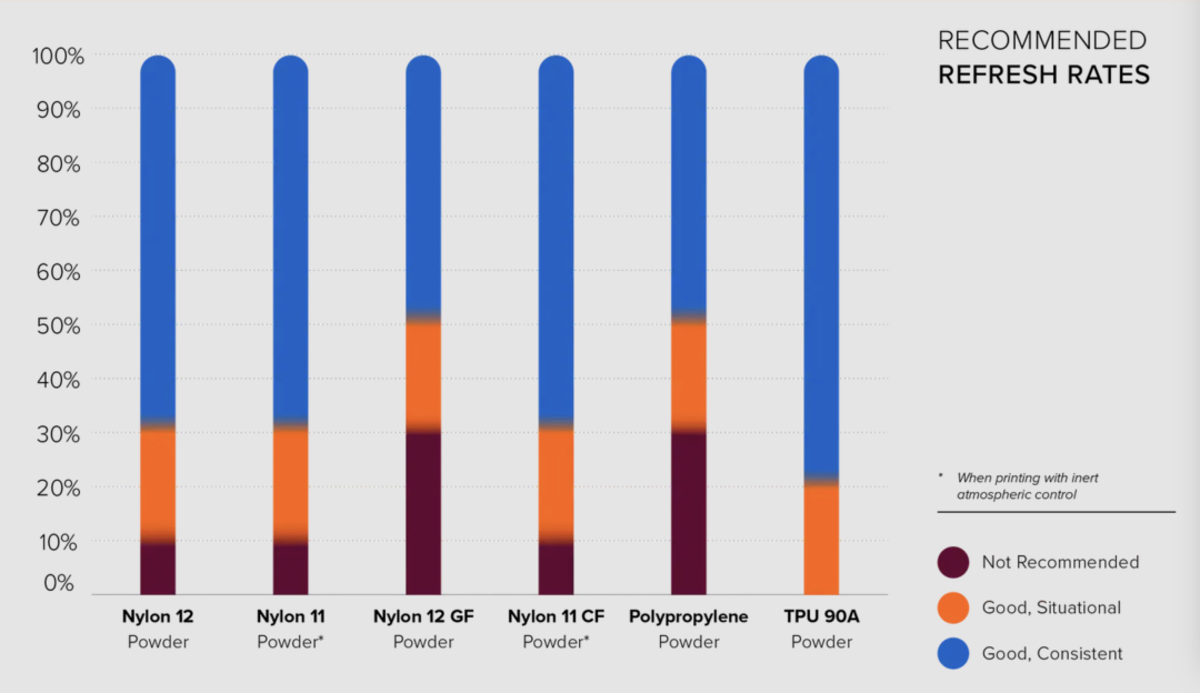 从成本上考虑,虽然刷新率越低,每个零件的成本越低,但使用回收粉末经过太多次循环可能会导致材料性能下降。因此,每个用户需要根据多个因素确定每个新粉盒的刷新率。