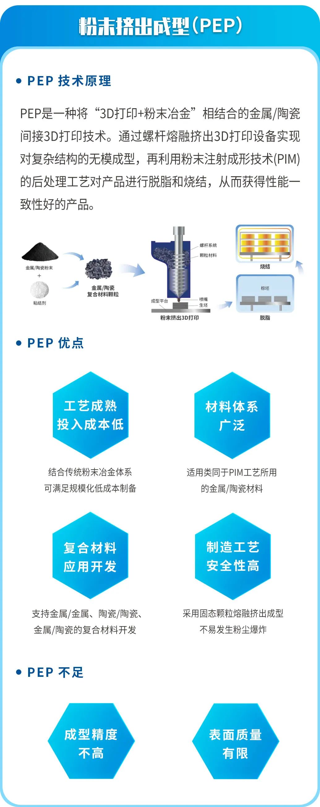 - 成型方式:SLM采用激光熔化材料原粉直接得到制品,而PEP则采用原粉加粘结剂混合后的颗粒料挤出成型,再通过烧结获得制品;