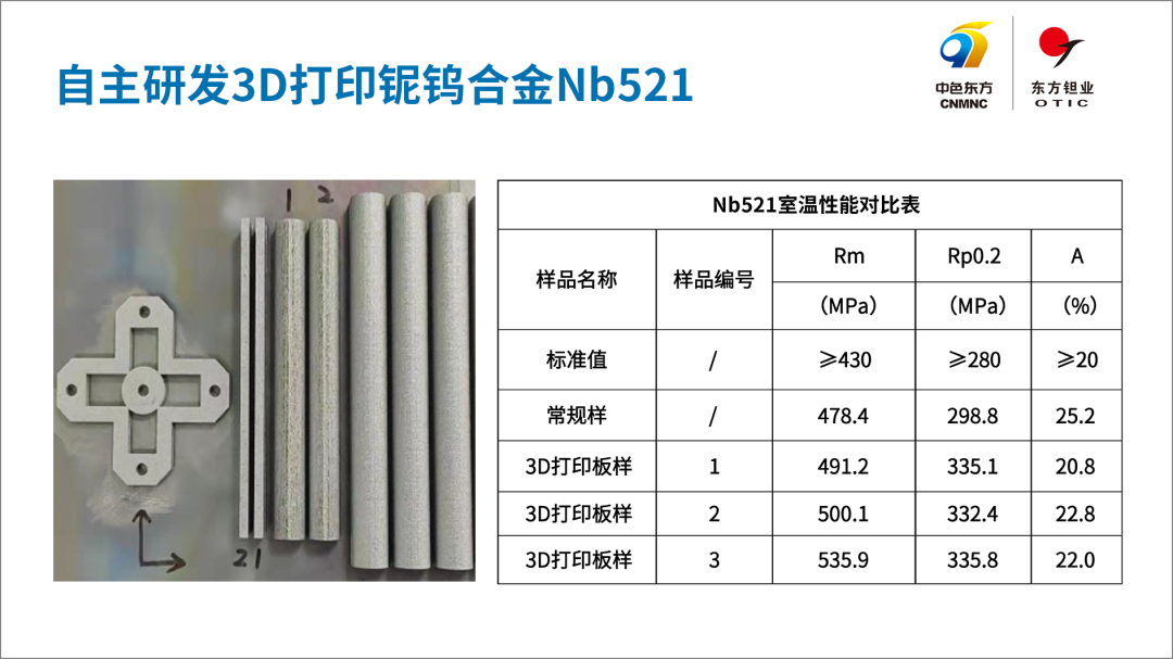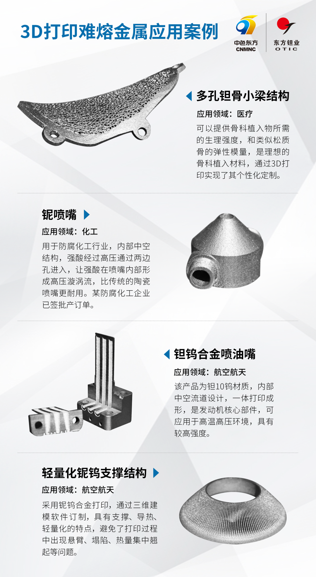在航空航天领域,以钽钨、铌钨为代表的难熔金属是制造高温部件的理想材料;消费电子领域中,钽钨、铌钨等难熔金属具有高电容密度、稳定性好、漏电流小等优点,被广泛应用于各种电子设备中;在化工领域里,铌钨等难熔金属的耐腐蚀性使其成为制造化学反应容器和管道的不二之选,保障生产的安全和高效;高端医疗器械产品中,可用于植入物,制作的射线屏蔽防护部件可保护患者和医护人员免受辐射伤害。以铌合金(Nb)为例,属VB族难熔金属,熔点2468℃,为bcc结构,强度能保持到1649.90℃,并能承受一定的机械变形。由东方智造自主研发的3D打印铌钨合金Nb521,性能有显著提升,主要应用于航空航天领域,包括燃烧室、发动机鼻椎、排气管、喷油嘴及其重要高温部件。截至目前,东方智造科研团队已完成5种增材制造用球形粉工艺、3种难熔金属的3D打印工艺研发;完成某医疗器械公司多例人体骨置换多孔钽结构件打印并应用于生物学验证;简化设计了火法分厂电子束炉反应电极,经过验证后实现3D打印批产;完成数十件钽钨合金表壳及多件钽和钽钨首饰、制品3D打印,成功实现难熔合金个性化订制。