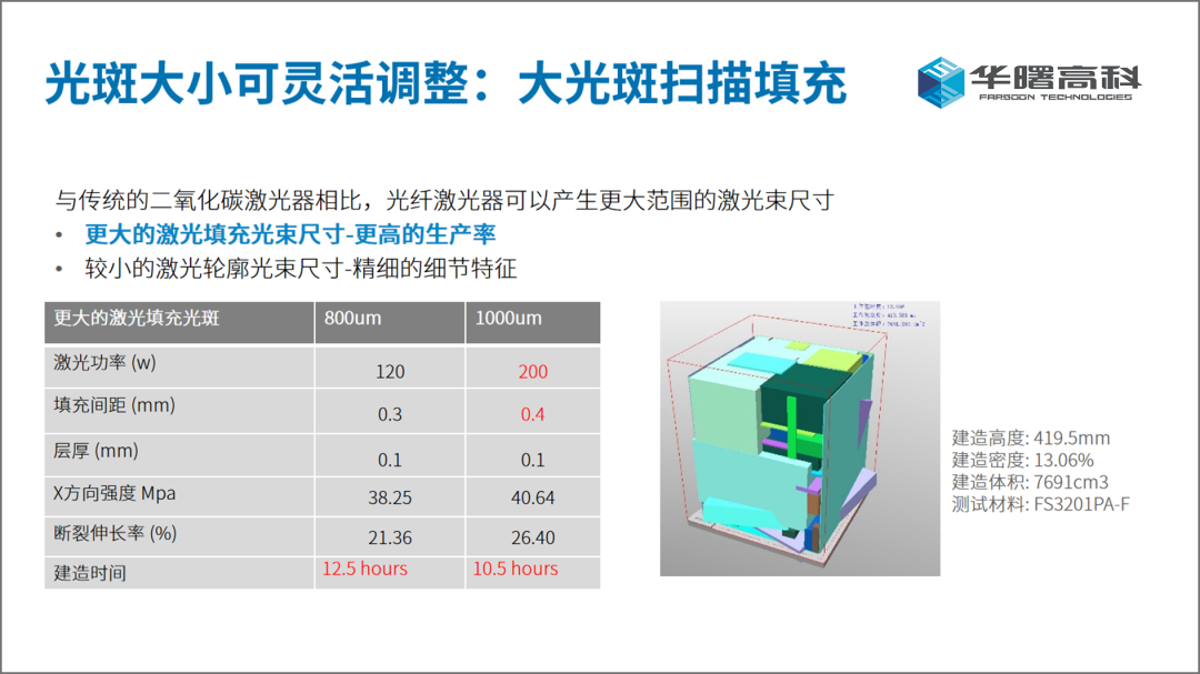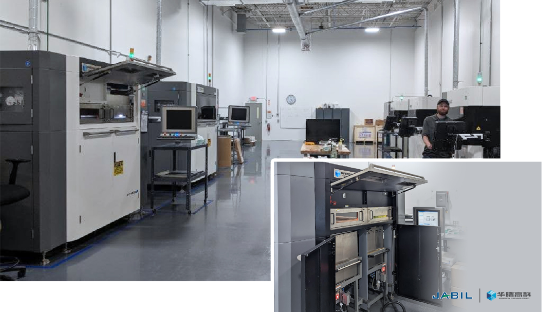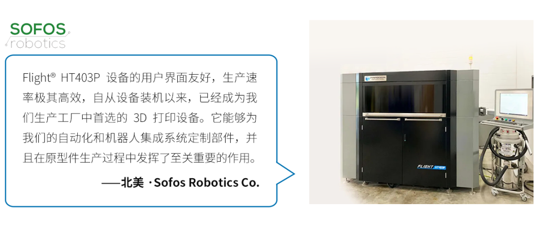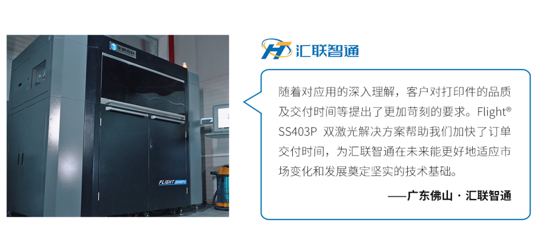 2019年,华曙高科全球首发Flight® 技术,通过独创的高分子光纤激光烧结系统,打造了行业领先的生产率和细节;2021年,华曙高科发布Flight® 403P系列双激光设备,为终端生产型用户提供更高生产力;2021年,加工服务领域产业化合作伙伴——佛山汇联智通打印科技有限公司,引入第一台Flight® SS403P双激光设备,实现更高效快速精细生产,有效提升市场竞争力。截止目前,包含Flight® 403P系列在内的华曙高科400尺寸SLS高分子3D打印设备,在全球装机量已超270台。华曙高科全球众多生产型用户正采用稳定成熟的光纤激光解决方案,实现高品质终端件的高效生产。在通常情况下,如果追求细节性能,就会牺牲生产效率,反之亦然。然而,通过细致的成本核算表明,Flight® 403P系列能够兼顾生产型用户对效率、质量、成本的极致追求,可代替小批量注塑模具业务,助力产业化批量生产。单激光SLS设备、单激光Flight® 设备、双激光Flight® 设备解决方案生产效率对比凭借超过20米/秒(66英尺/秒)的扫描速度,Flight® 403P系列打印效率比Flight® 单激光提升45%,比常规CO₂激光器设备高190%,单缸打印时间10小时,一天可以打印二缸,实现超高的烧结效率,将增材制造产能提升到一个新高度。Flight® 403P系列采用了一套独特的扫描算法、强大的全数字动态聚焦系统并具有完全开放参数的系统优势。与普通激光烧结系统相比,Flight® 403P系列能够在加工表面实现更均匀的能量分布,具有更精细的光斑直径,同时确保整个烧结过程中良好的能量渗透。根据光学配置,激光束尺寸可以小到60-70um。与其它高分子粉末床技术相比,Flight® 403P系列生产的部件具有更佳的细节,最小可达0.3毫米(0.012英寸)薄壁极限,同时具备与普通激光烧结部件相同的性能。华曙高科Flight® 403P系列设备,采用强大的光纤激光器取代普通激光烧结系统的CO₂激光器。与普通CO₂激光器相比,光纤激光系统为粉末床提供了更高的激光功率。光纤激光系统更强大更稳定,使用寿命更长,能够提升产业化应用客户的投资回报率。Jabil生产车间内安装运行的华曙高分子3D打印设备及Flight® 403P系列设备华曙高科合作伙伴——全球制造业巨头捷普Jabil公司对于3D打印部件的经济性进行了精细的测算,对比了开模具和使用华曙3D打印设备生产同一批组件的成本效益:“模具的费用一般为5万美元,当组件数量小于37,313个的时候,使用华曙的高分子设备3D打印更具成本效益;当组件数量大于37313个的时候,开模生产更加适合;而如果与华曙的Flight®技术对比,这一临界数值将提高到64,935个。”