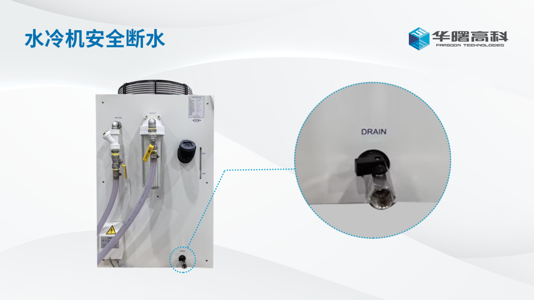 对于温度在零度以下的地区,如果室内没有暖气保证室温恒定,需要关闭水冷机,并将水管和设备内部的水完全排空。