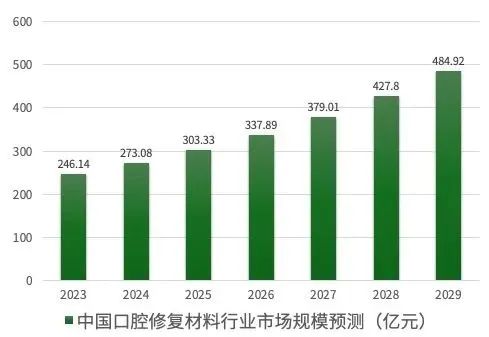 有数据显示,中国口腔修复材料行业市场规模已从2018年的148.58亿元人民币增长到2022年的222.16亿元人民币。专业机构预测,到2025年,口腔修复材料市场规模将达到303.33亿元人民币,复合年增长率为10.0%。到2029年,中国口腔修复材料行业市场规模将达到484.92亿元。