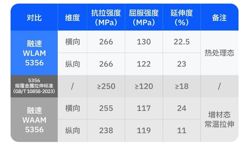 据融速科技方面介绍,通过工艺优化,采用激光送丝增材平台Laser One打印的5356铝合金样件,经热处理后展现出优异性能:
