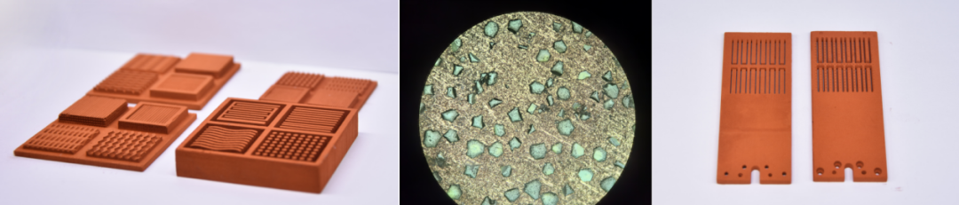 相较于传统制造技术,三帝科技的BJ技术具备三大核心优势:一是无需模具限制,可实现一体化成型,能轻松打印异型流道甚至拓扑复杂结构,解决了传统工艺无法制备复杂微通道的难题;二是通过自主研发的粘结剂与自研设备,可精准控制铜粉与金刚石粉的均匀分布,金刚石混合掺杂比最高可达70%,结合低温烧结工艺,有效避免金刚石石墨化,确保热导率最大化且稳定;三是可实现铜与金刚石梯度打印,最表层的铜可实现精密加工,兼顾表面粗糙度与热导率,最终使散热器热阻较传统产品直降50%以上,芯片表面峰值温度下降30%+,散热能力翻倍,真正实现高功率芯片的瞬时散热。