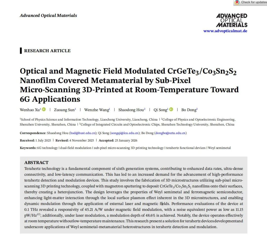 由中国聊城大学、深圳大学、深圳技术大学联合完成的研究成果《Optical and Magnetic Field Modulated CrGeTe₃/Co₃Sn₂S₂ Nanofilm Covered Metamaterials Fabricated by Sub-Pixel Micro-Scanning 3D Printing for 6G Applications》发表于国际著名期刊 《Advanced Optical Materials》 。研究中,团队采用普利生亚像素微扫描3D打印技术,成功制备了具备局域表面等离子体增强效应的三维微结构,为6G核心器件提供了关键制造支撑。