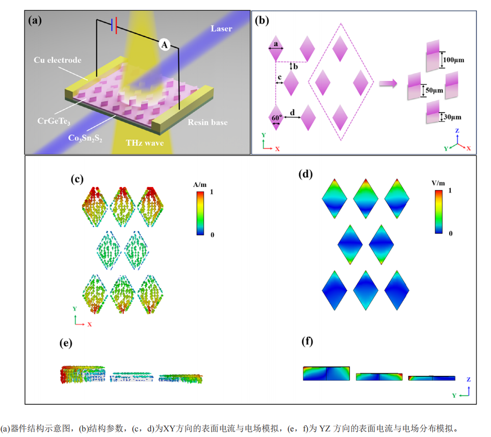材料组合:将磁性外尔半金属Co₃Sn₂S₂(高载流子密度、室温磁响应)与准二维范德华铁磁半导体CrGeTe₃(强太赫兹吸收)构建异质结,整合光电与磁电特性。
