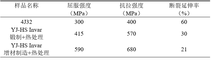 表2. 锻制和增材制造YJ-HS Invar合金与4J32 Invar合金的强度对比
