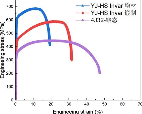 图2. 增材制造和锻制YJ-HS Invar与4J32 Invar合金的拉伸应力-应变曲线