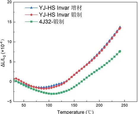 图1. 增材制造和锻制YJ-HS Invar合金与锻制4J32 Invar合金的热膨胀曲线