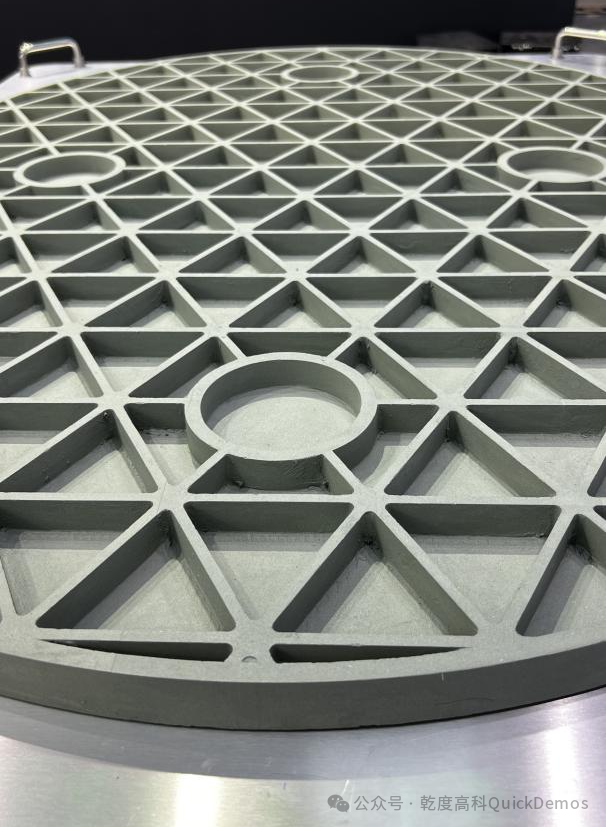 另外,展会期间乾度高科隆重推出“1.2米”光固化陶瓷3D打印装备(以下简称“CeraFactory1200”)并展示了CeraFactory1200设备打印的口径为1.1米碳化硅打印产品。