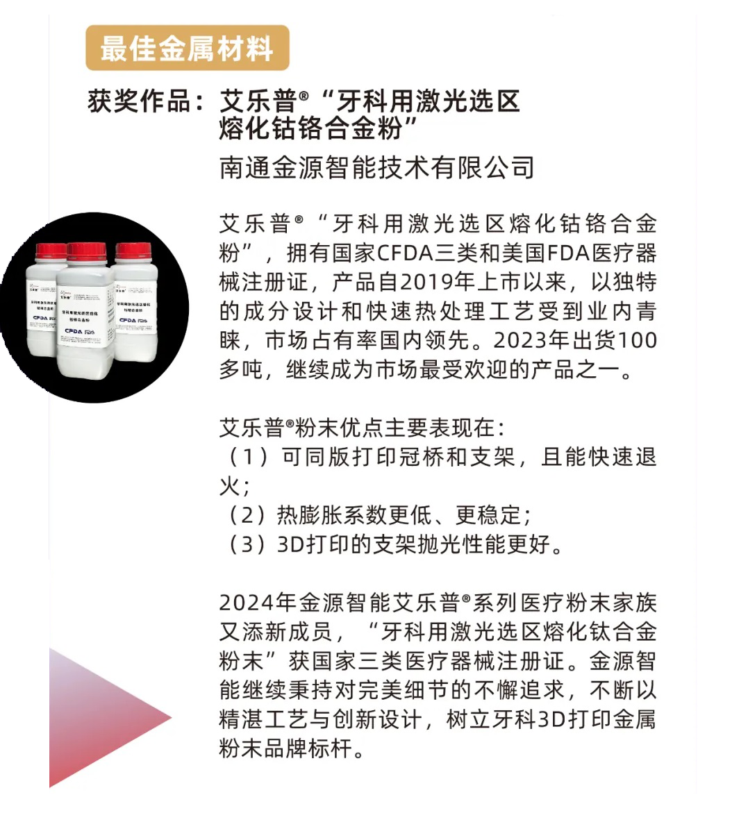TCT Asia Awards是增材制造行业的一项重要奖项,由行业内的权威专家和机构独立评定,旨在表彰在增材制造领域取得杰出贡献的企业和产品。金源智能生产的钴铬合金粉,凭借其高强度、高耐腐蚀性以及优异的生物相容性,在口腔医疗领域有着广泛的应用前景。