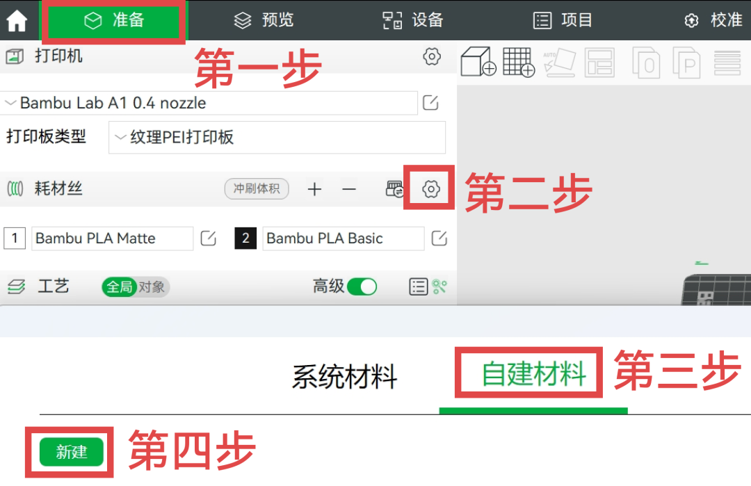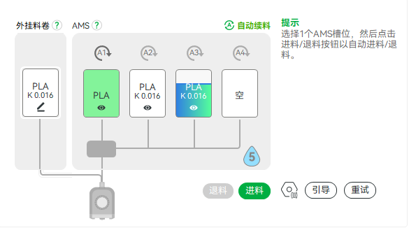 用户可通过 Bambu Studio 新建和管理自定义耗材配置文件,同时可在 Bambu Studio “设备”页面的槽位上选择自建的耗材配置。该配置将同步给设备及 APP 端。