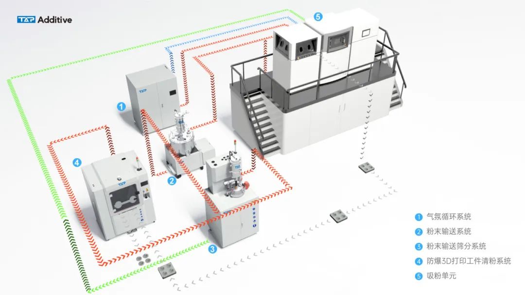TCB系列清粉设备可用于单台打印设备,也可通过不同组件,构建一个闭环的粉末管理系统。例如与气氛循环过滤系统、粉末输送系统、粉末输送筛分系统、吸粉单元组合,组成系统化筛分清粉方案。这种自动化的流程,降低了操作人员的劳动强度与安全风险,也降低了粉末污染的风险。