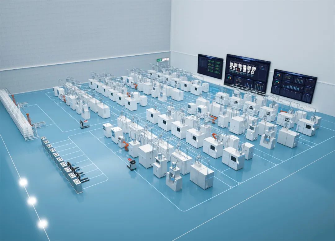 该方案实现从粉末仓库的取粉—机器人运输粉末—协作机器人加粉—储粉机—粉末混合+干燥—3D打印—筛分—机器人运输工件—拆包—清粉—机器人去支撑、打磨/抛光-机器人运输工件入库的全流程无人化操作。