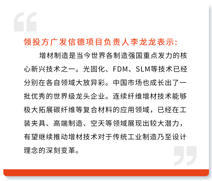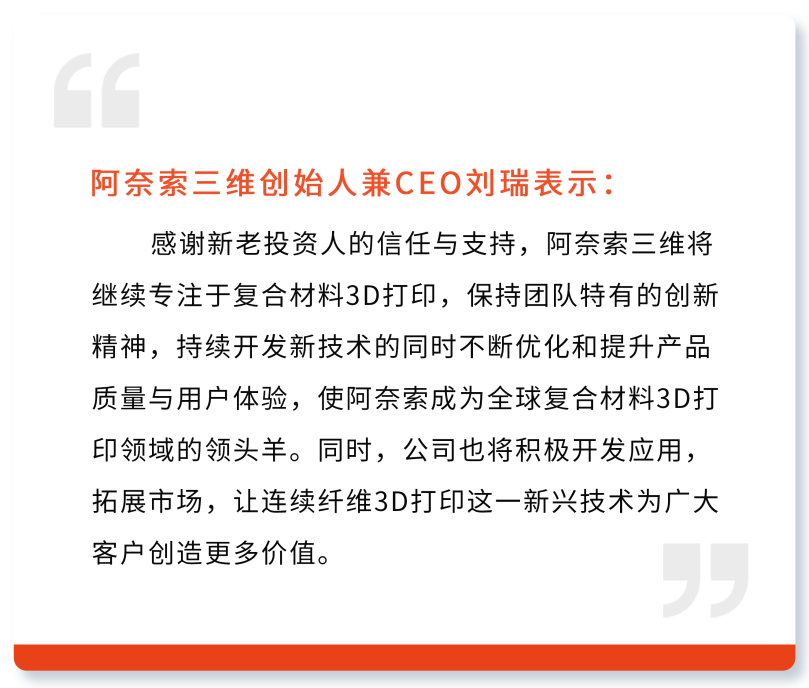 2024年12月23日,阿奈索三维成功完成近亿元人民币A轮融资。公司专注于高科技复合材料连续纤维3D打印,成立伊始便获得顶级风险资本的支持,本轮融资由广发信德领投,国鼎资本,合世家资本跟投,阿奈索赢得了产业资本、头部风险投资机构、私募股权投资等各类投资人的支持与认可。这笔资金将用于加速推动产品研发、产能扩建以及全球业务布局。