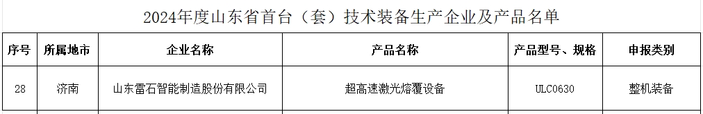 近日,山东省工业和信息化厅公布了《2024年度山东省首台(套)技术装备生产企业及产品名单》,山东雷石超高速激光熔覆设备成功入选。