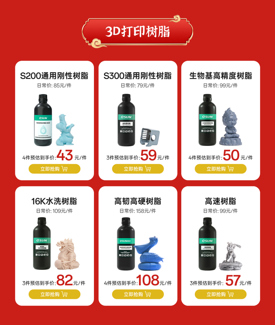 eSUN易生新品树脂材料16K 水洗树脂材料已于12月上线,其打印模型精度高,同时基于树脂特有的哑光特性,使得打印模型表面更细腻逼真,效果更好。若要打印蛇年相关手办模型,或可一试哦~