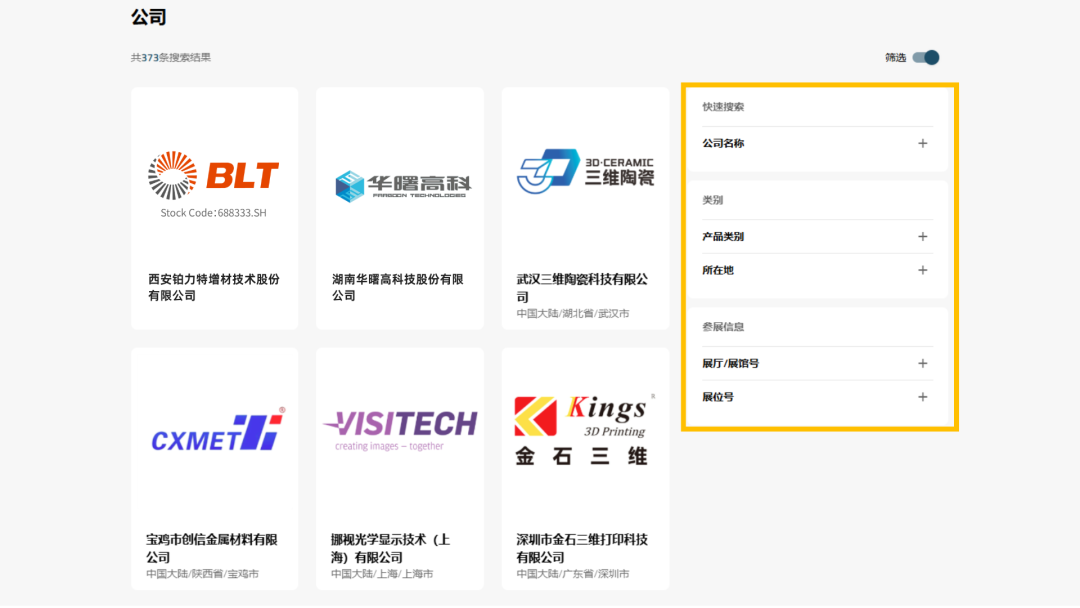 点击【公司名称】,输入公司名的关键词浏览展商名录。 或根据展商所属产品类别、所在国家/地区、展位号、展馆等多维度信息,精准筛选搜索目标。