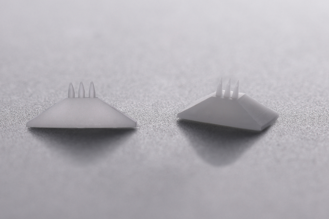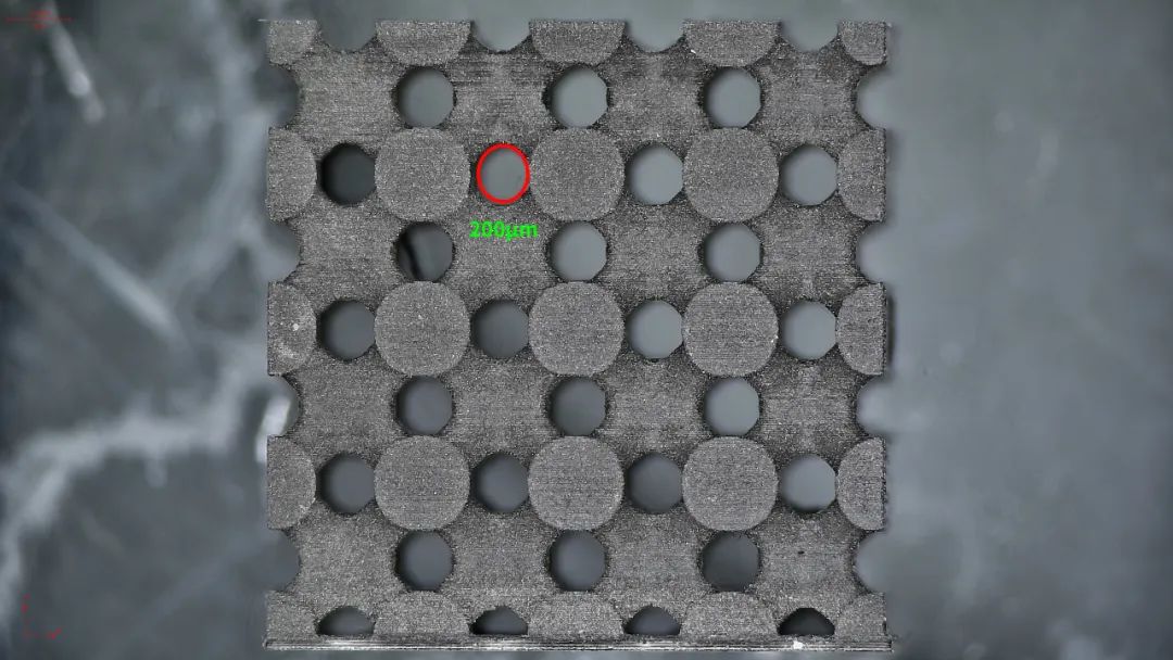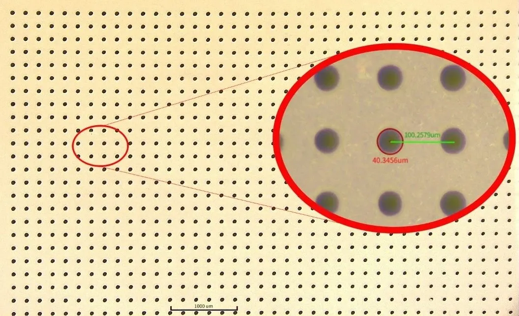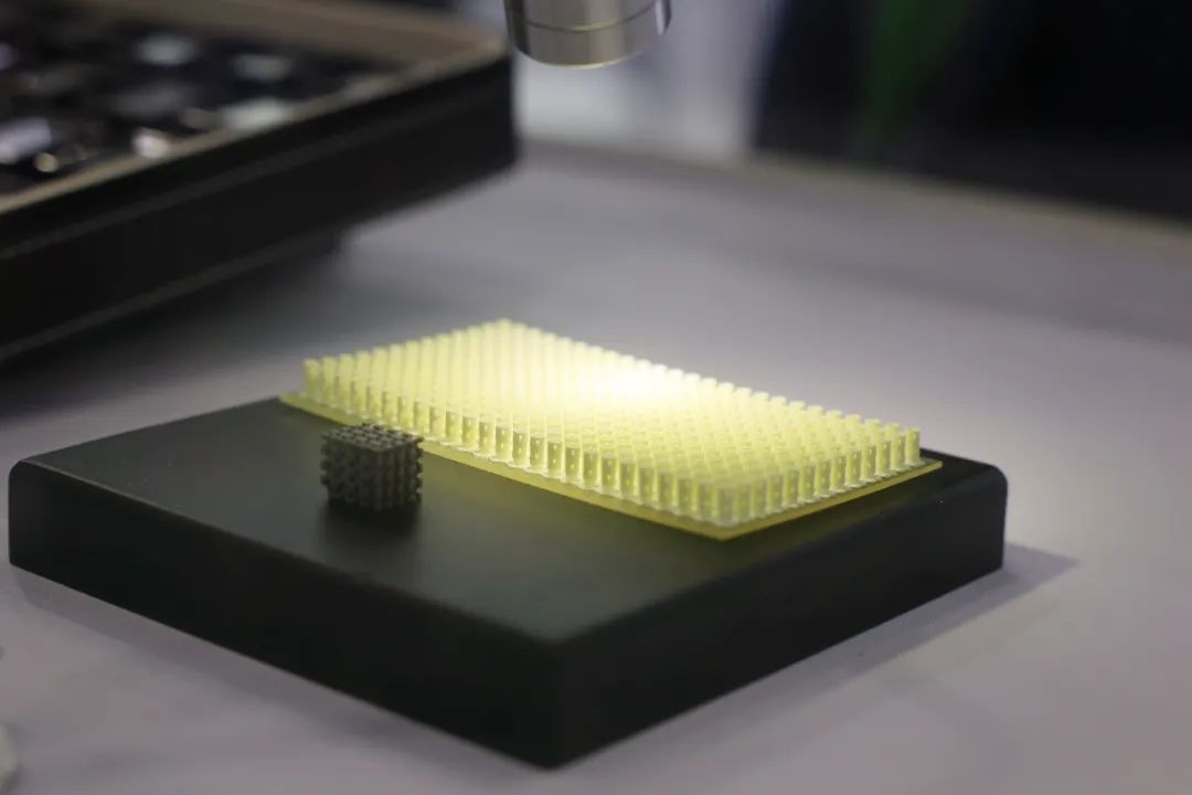 普利生利用微纳3D打印技术,能够在短时间内完成高精度的微孔阵列陶瓷基板的制造。可以在1平方厘米的陶瓷片上打印出数万个孔径为40微米、间距100微米的微孔,陶瓷拥有比玻璃更好的导热性和强度,因此未来可能在替代玻璃微孔板的应用领域内有所突破,例如发光背板和芯片封装等。