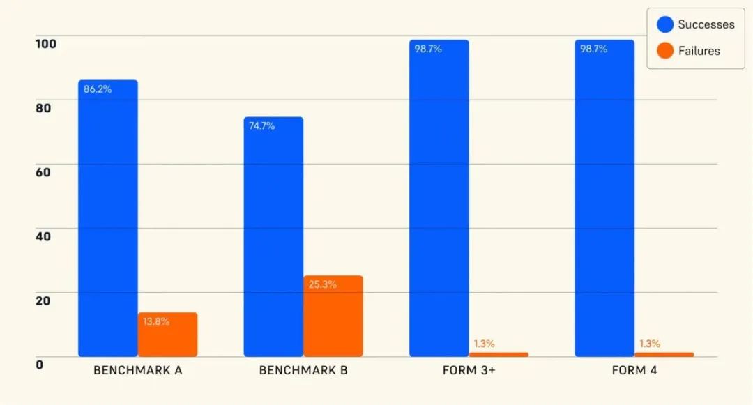 Form 4 和 Form 3+ 的失败率各为 1.3%,而基准 A 的失败率为 13.8%,基准 B 的失败率为 25.3%,表现最差。这些失败率往往直接影响部件成本、失效模式和影响分析 (FMEA) 以及许多其他重要标准。参阅白皮书,了解各个模型的失败详情。