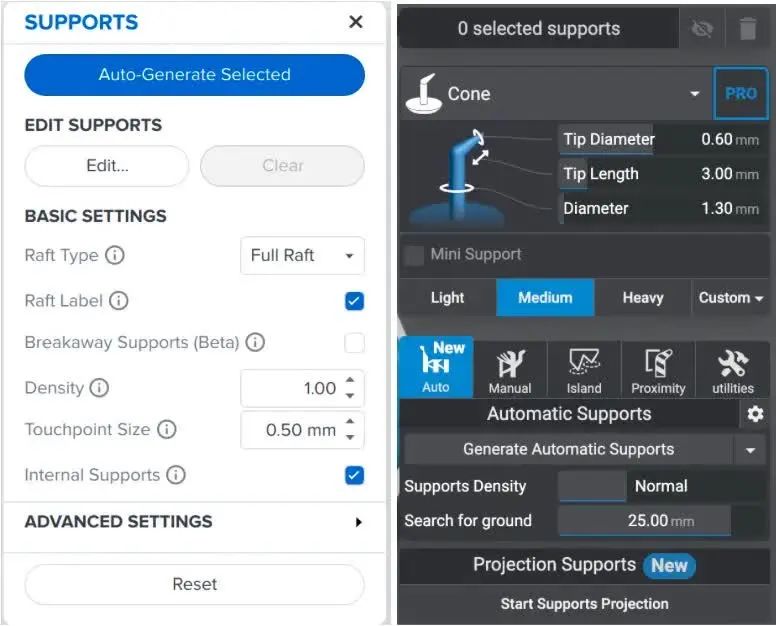 使用标准设置时,PreForm(左)和 Lychee(右)中的自动生成支撑结构工具。