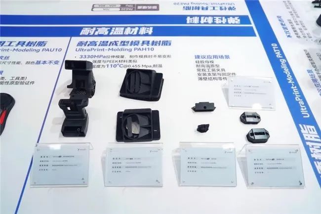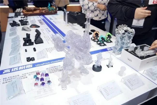 在本次展会上,黑格科技重点展示了其高性能材料系列,包括高透树脂 PAT10,其88.5%透光率与亚克力材料类似,高透且韧性强,在室内放置8年不变黄,建议应用场景包括透明及半透明手办模型及其配件、耳机外壳(成品)、消费电子产品外壳(原型验证)等。
