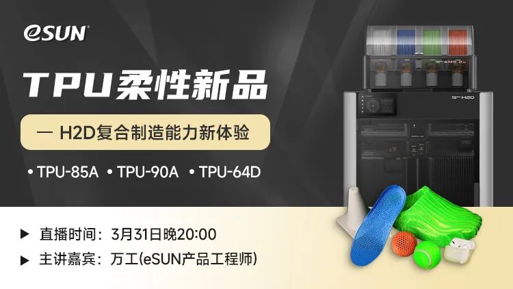 3月31日晚,eSUN易生将在直播间正式发布以上三款新品柔性材料,详细分析其性能及差异化应用方向,同时,结合拓竹科技H2D新机型发布引起的关于高性能材料复合制造能力的探索热潮,进一步展示eSUN易生多款柔性3D打印材料在新设备上的打印表现,敬请期待。