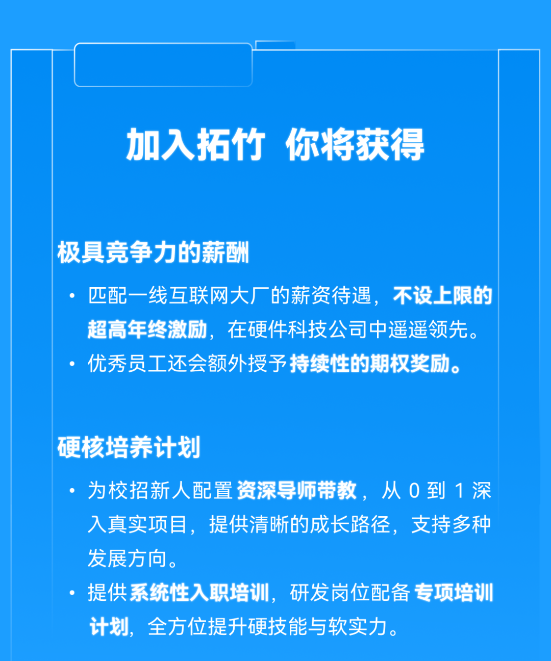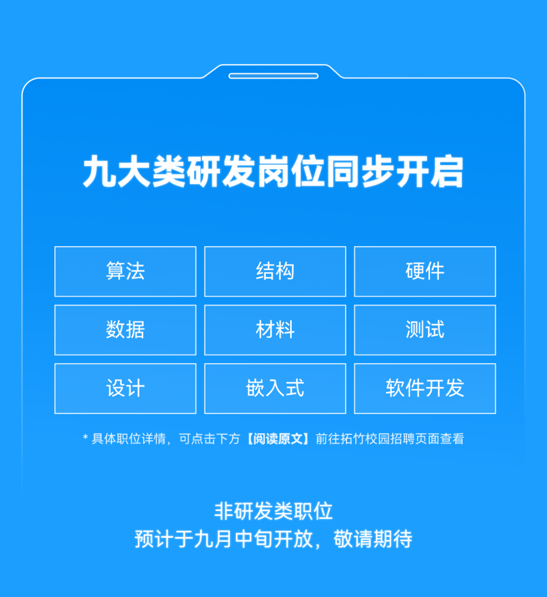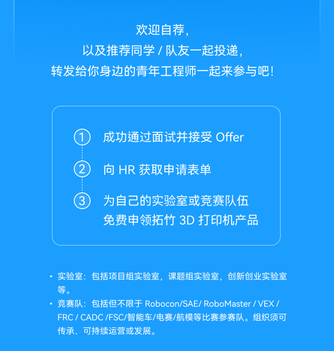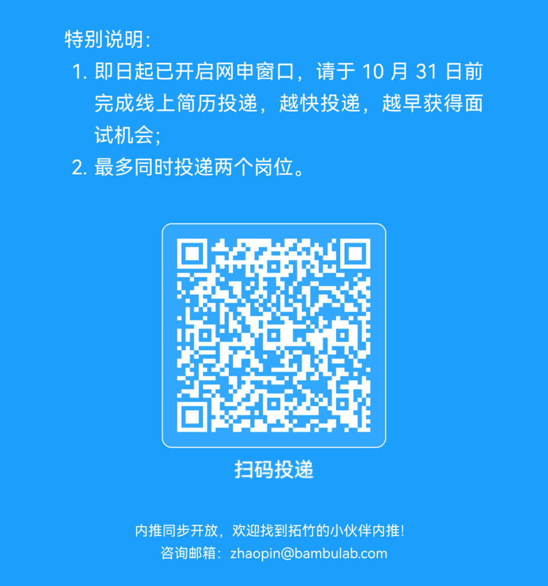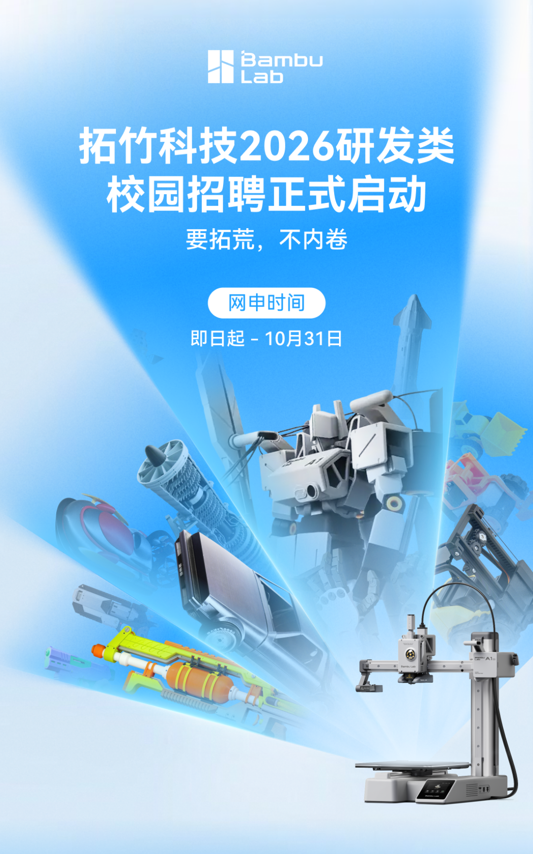 【增材智造网】拓竹科技 7月16日宣布2026届研发类校园招聘正式启动,面向全球高校招募软件、硬件、算法、机械结构、测试等方向的未来工程师。招聘流程含网申、笔试、面试、Offer,即日起登录官网即可投递,优秀候选人可获提前实习及专属导师培养。公司提供具有竞争力的薪酬、股权激励及国际化研发平台,助力应届生快速成长。