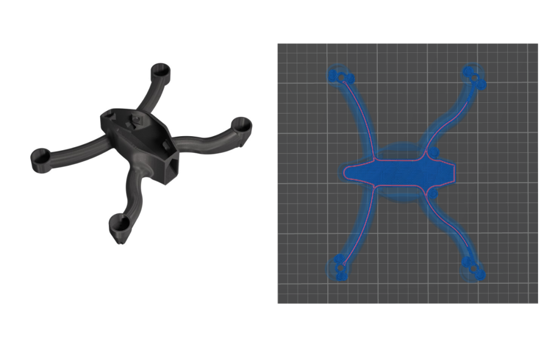 中纤三维专注于打造前沿的复合材料3D打印整机系统与一体化解决方案,致力于推动航空航天、汽车制造、工业工装、教育科研以及电子电动等多个行业领域向定制化、高效能的复合材料制造发展。在无人机部件上通过自研切片软件Bulber,进行纤维力流仿真,实现纤维最优铺排,使得最终零部件在轻量化的基础上,实现更强性能。