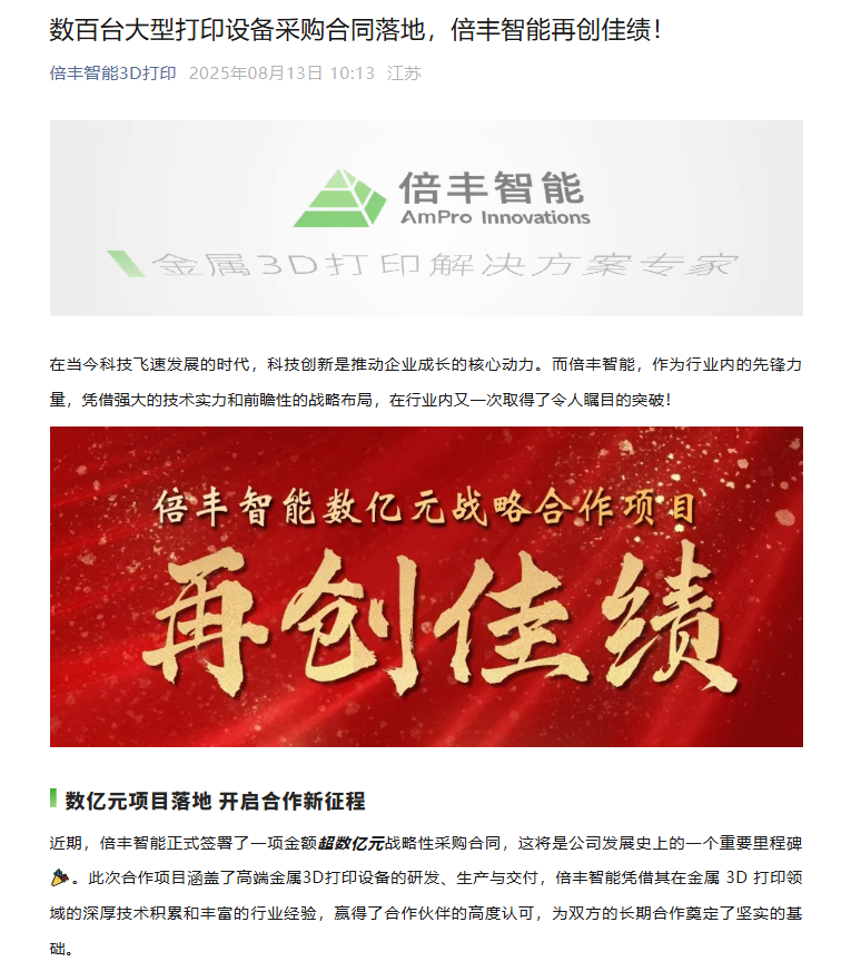 最近,3D打印圈炸开锅了——倍丰智能宣布正式签署了一项金额超数亿元战略性采购合同。一家国产企业一口气签下数百台大型金属3D打印设备的采购合同,金额超数亿元!这背后藏着怎样的行业密码?今天咱们就来聊聊倍丰智能的这场“技术突围战”,看看他们如何用“超米级打印”打开新赛道。