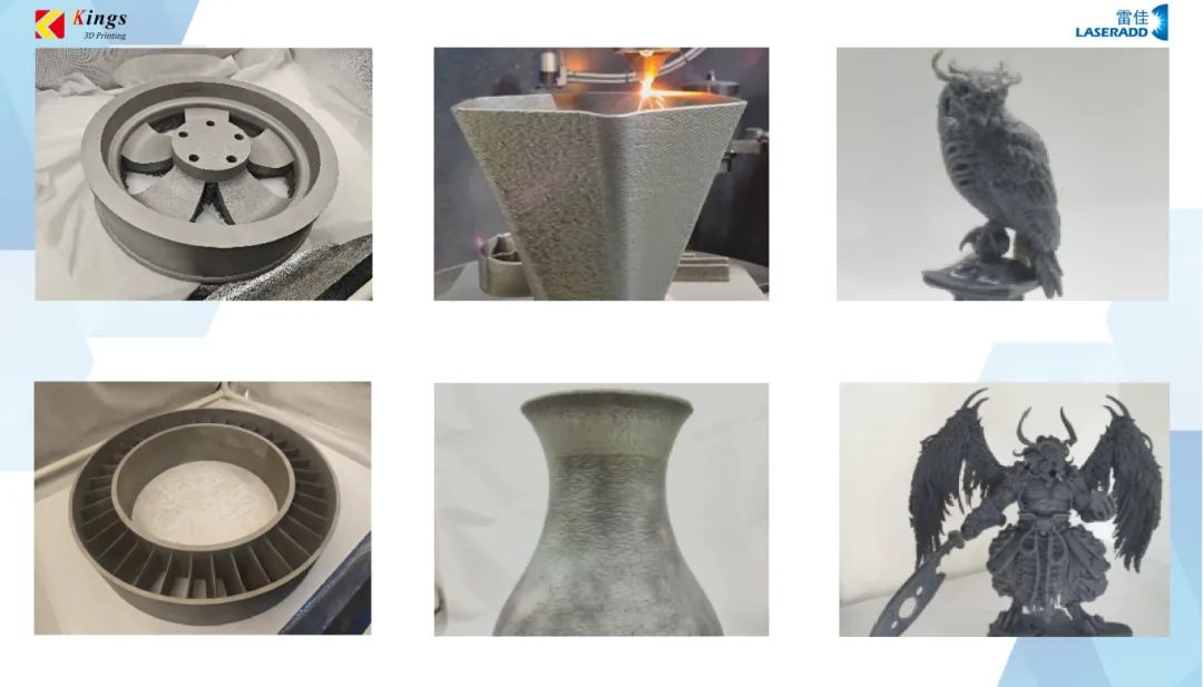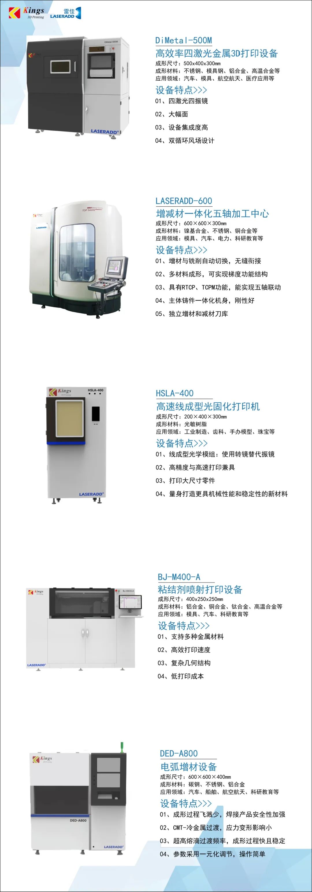 五轴增减材数控机床LASERADD-600、电弧增材设备DED-A800和3DP金属打印设备BJ-M400-A、高速线成型光固化打印机HSLA-400以及金石金属3D打印机DiMetal系列的最新产品——高效率四激光金属3D打印设备DiMetal-500M。