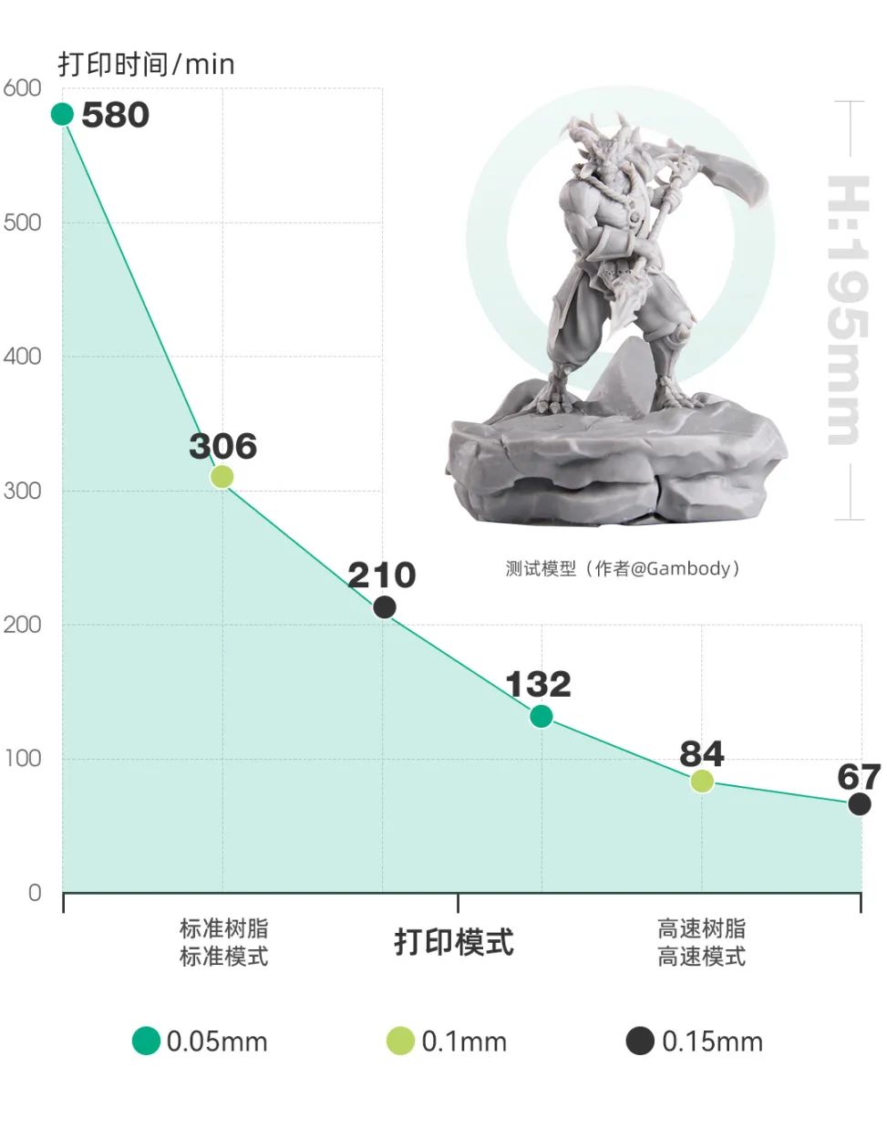 1. 当层厚设置为0.15mm时,使用普通树脂在普通模式下打印该测试模型所需时间为210分钟,使用高速树脂在高速模式下则仅需67分钟;