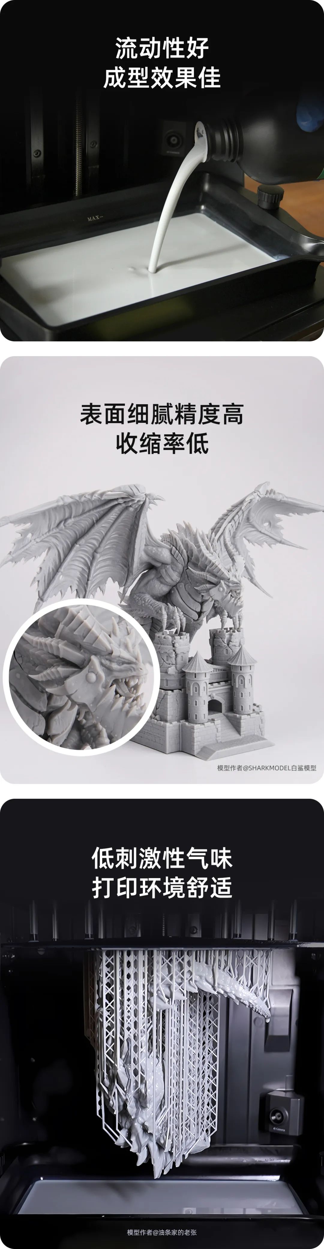 2. 粘度低,因此树脂回流快,打印时层与层之间不影响;