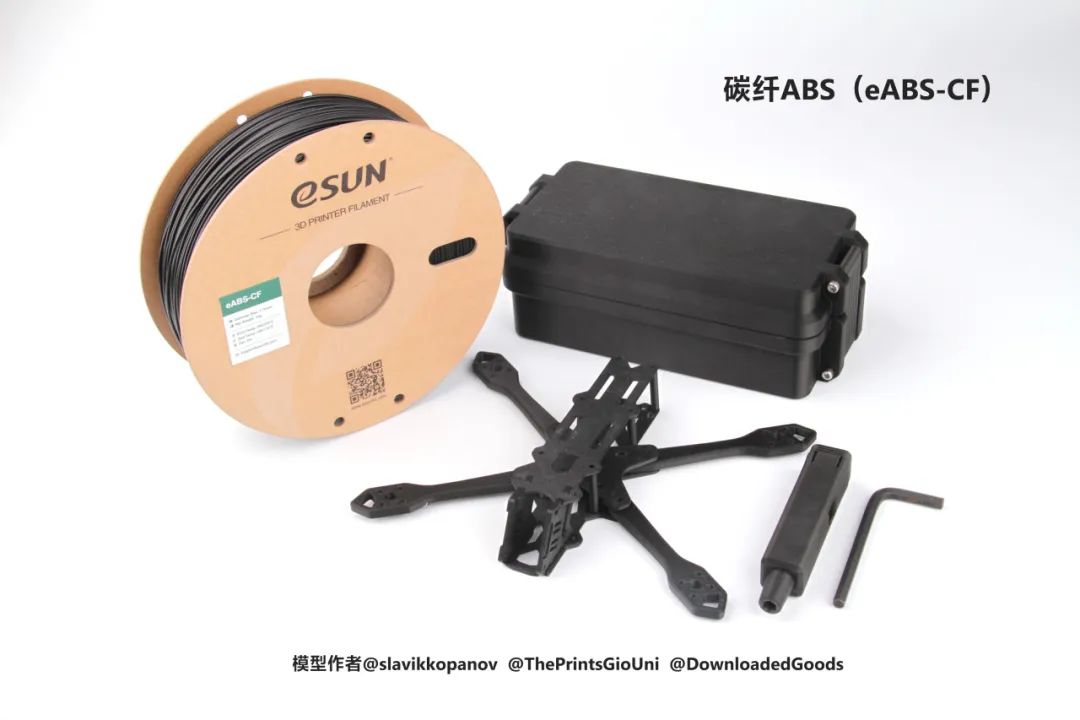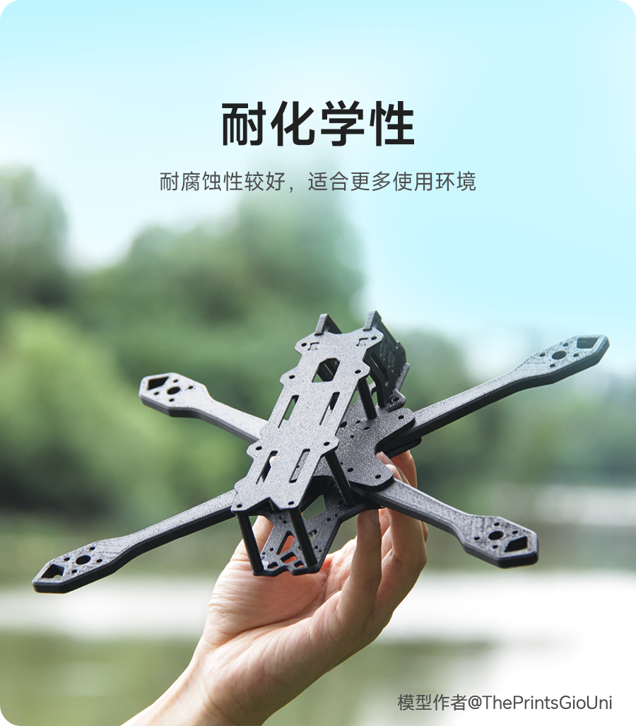 此外,碳纤维ABS还具备轻量化的特点,材料密度低,打印模型的重量较一般材料更轻,因此也可以适用于无人机、航模、船模等模型的快速制造。