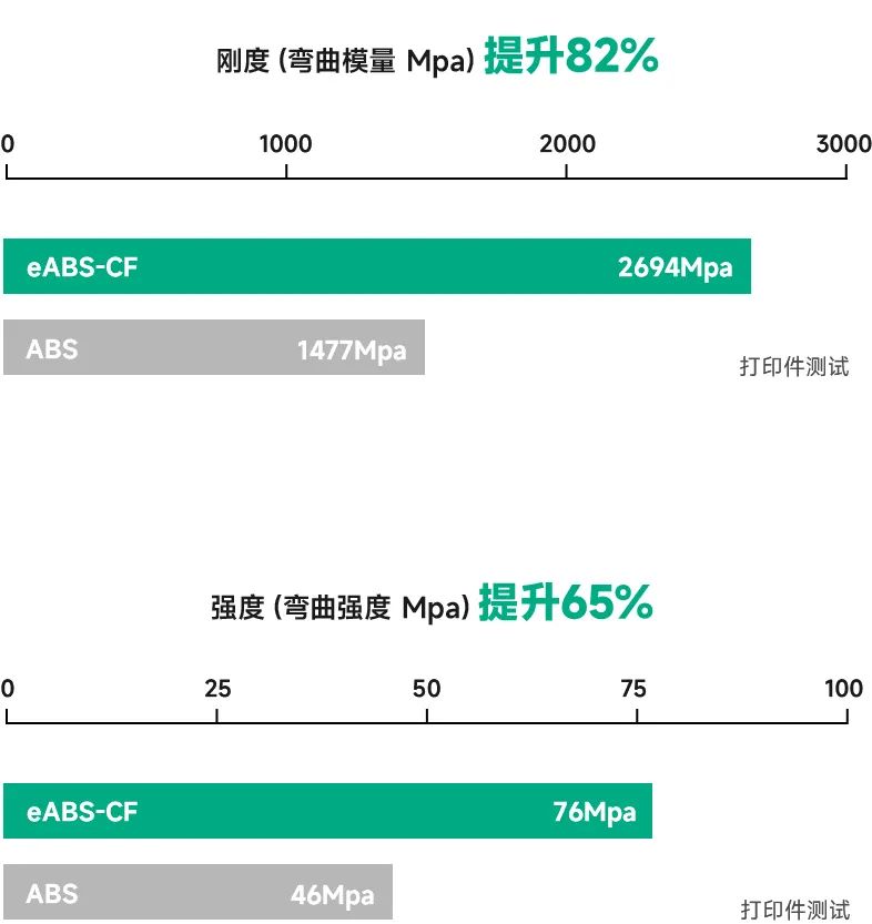根据打印件测试结果表明,相比普通ABS材料,eABS-CF的刚性和强度都有较大提升,其中eABS-CF弯曲模量达2694Mpa,提升82%;弯曲强度则从46Mpa提升至76Mpa,增幅为65%。