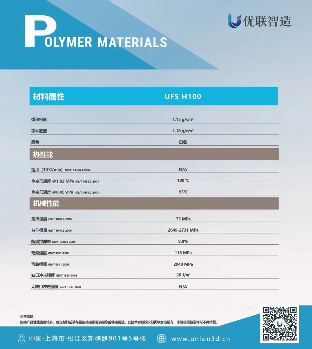 该材料型号:UFS H100光敏树脂材料,相比普通的光敏树脂白料,韧性更高,耐温更好,可以避免因为温度导致的受热变形的风险,满足用户在手板样件、汽车管道、医疗护具、原型验证、展示模型、产品外观件等制作需求。