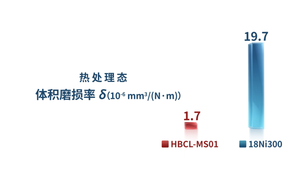 耐磨模具钢HBCL-MS01,则以其卓越的耐磨性能脱颖而出,热处理态洛氏硬度高达55,体积磨损率仅为1.7×10-6mm3/(N*m),显著优于18Ni300模具钢,为模具制造等领域带来更多的探索和应用。