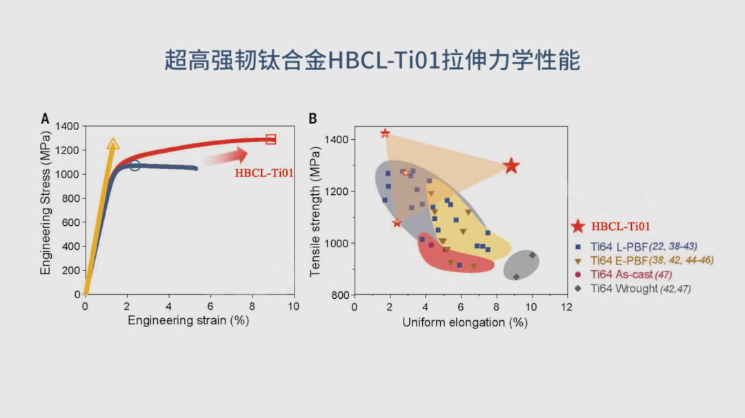 而超强韧钛合金HBCL-Ti01,更是将强度与塑性完美结合,抗拉强度近1.3GPa的同时,均匀伸长率达到8.8%,加工硬化能力超过300MPa,未来将在航空航天等领域具有广阔的应用前景。