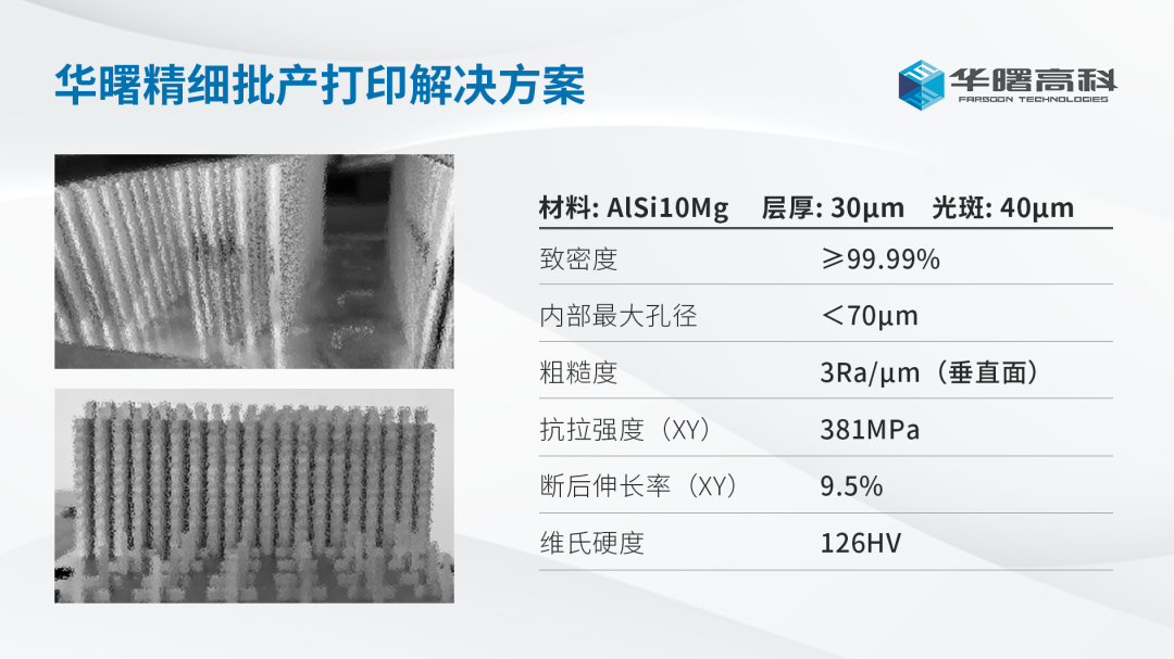 华曙高科面向批量生产用户优化升级的金属设备FS200M,其打印精度、效率、稳定性均经严格测试验证,旨在从成形工艺、成形质量等多方面提高产品市场竞争力,为用户赋能。以铝合金为例,采用40μm精细光斑、30μm层厚工艺打印的工件致密度达99.99%。与此同时,FS200M采用自研的多激光高精高效协同控制技术,搭接调试效率高,搭接校准精度稳定控制在±0.05mm以内,搭接区力学性能与单激光无明显差别。并具有大小层厚结合和抽壳功能,针对工件不同部位应用不同工艺参数。目前,精细批产打印解决方案可应用的典型领域包括消费电子、医疗、精密模具、探测工具、科研教学等——