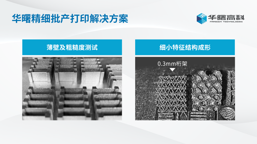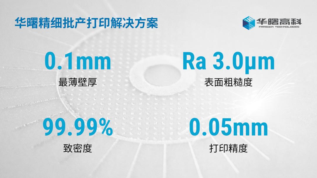 随着面向万物互联的5G通讯和新能源汽车等高端应用场景的快速拓展,能满足大容量数据传输、高速高密度信号传导的小型化、精密化的消费电子器件,其批产需求正不断增长。2022年,华曙高科发布面向批量生产用户金属增材制造双激光设备FS200M,目前已经汽车、航空航天、模具、消费品等领域多种产业化生产场景的应用考验,其打印质量、效率、稳定性均受到各行业用户认可。2024年,华曙高科在设备稳定高效生产的基础上,经过多次优化和方案验证,推出FS200M全新解决方案——升级40μm精细小光斑,可直接成形粗糙度Ra 3.0μm的零部件,打印精度达0.05mm,最薄壁厚0.1mm,可有效满足消费电子、医疗、精密模具等行业对高精度部件批量化生产的迫切需求。目前,金属3D打印行业的一般打印精度超过0.1mm,表面粗糙度Ra值为7.0-20μm。消费电子产品零件尺寸小,结构精细,对于零件尺寸公差要求高,并要求更优质的表面质量,以减少后处理时间和成本,综合降低整体成本。与此同时,消费电子出货量大,对增材制造批产能力要求高,需要满足其精细工件打印批量化生产核心需求。面对打印精度、表面粗糙度及薄壁成形的苛刻要求,华曙高科自主研发面向批量生产的精细打印解决方案,可直接成形粗糙度Ra 3.0μm的零部件,打印精度达0.05mm,最薄壁厚0.1mm。