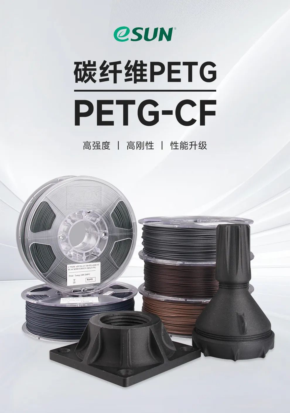 eSUN易生这款PETG-CF材料通过加入碳纤维,有效增强了材料强度、刚性、硬度,并减小了翘曲形变,可广泛应用于工装夹具、原型制造、电子电器以及汽车零部件的开发制造等。目前,PETG-CF已上线天猫易生旗舰店。