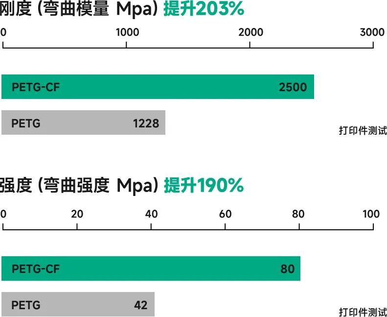 相比普通PETG材料,PETG-CF的刚性和强度得到了较大提升。根据打印件测试结果显示,PETG-CF弯曲模量达2500Mpa,相比普通PETG材料提升203%,弯曲强度提升幅度达190%。