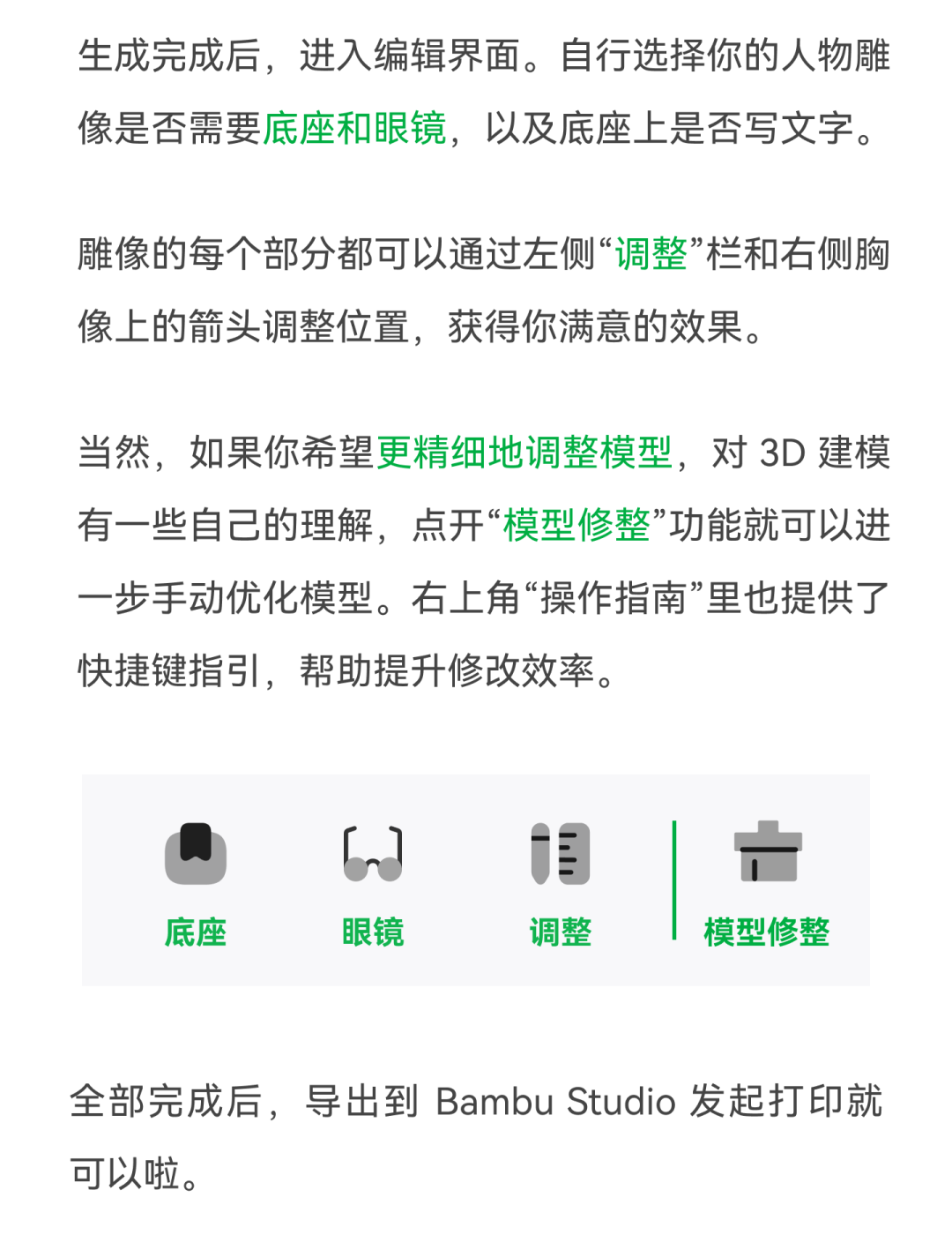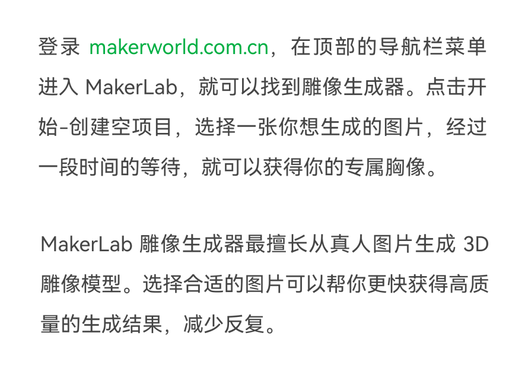 用户只需通过简单的操作,就能在MakerWorld平台上创建出独一无二的雕像。无论是纪念亲人、朋友,还是表达对某个历史人物的敬意,MakerWorld都能满足用户的个性化需求。这种一键生成的方式大大简化了传统雕塑制作过程,使得艺术创作变得更加便捷和高效。